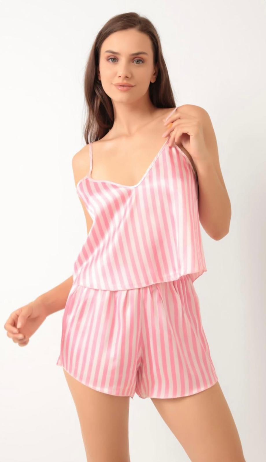 Düz Çizgili Şortlu Saten Takım